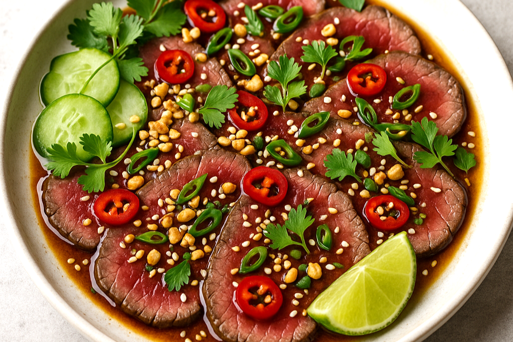 Here's a flavorful and light summer Asian-style Beef Carpaccio recipe using an eye of round roast—a lean and budget-friendly cut that's perfect when sliced thin. This version brings a fusion twist, pairing delicate raw beef with bold umami, citrus, and spice notes.